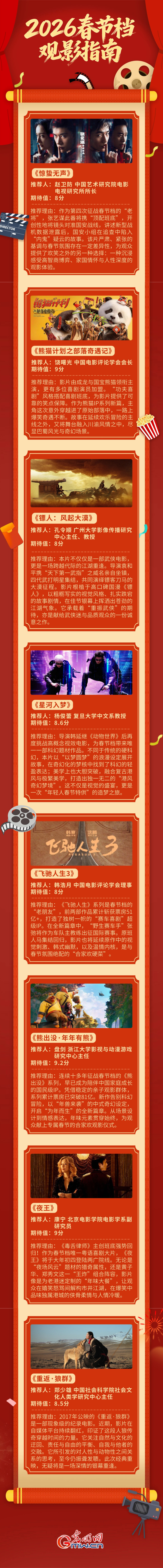 2026年春节档凭借长达9天的假期上风,成为了备受细心标“史上最长春节档”。摈弃2月11日,已有8部作风迥异的影片文告定档,笑剧、科幻、武侠、动画等类型一应俱全,一场不雅影盛宴行将开启!光明网特殊推出2026春节档不雅影指南,邀请多位巨擘影评东说念主、行业行家划重心、荐好片。看电影,过大年!!你准备去看哪一部,念念好了吗?