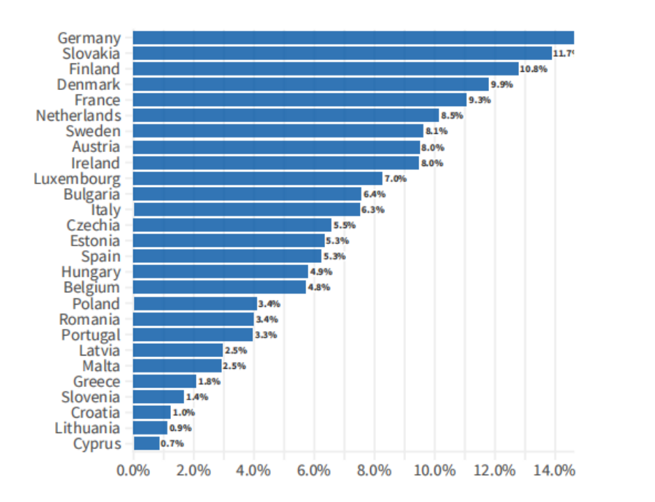 图5:2023年中国在各欧盟成员国入口中所占的份额(注:以上入口数据统计不包含欧盟成员国之间的买卖)。 府上来源:欧洲统计局