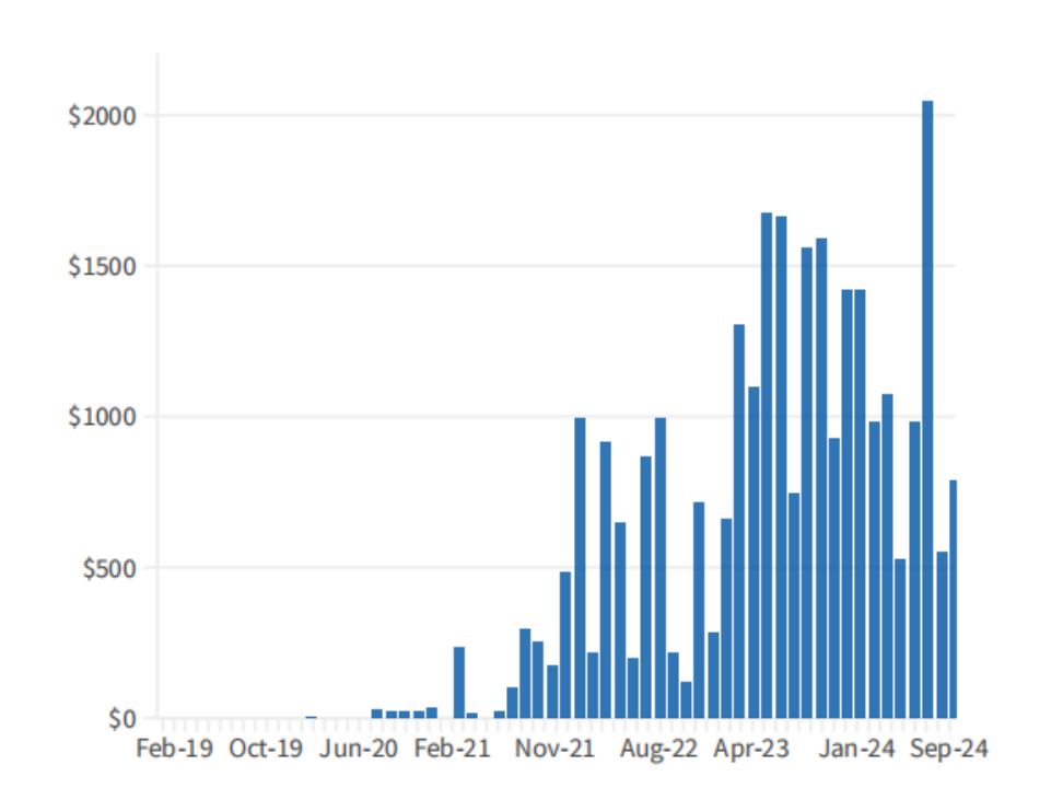 图1:中国对欧盟成员国电动汽车月出口金额(单元:百万好意思元/月)