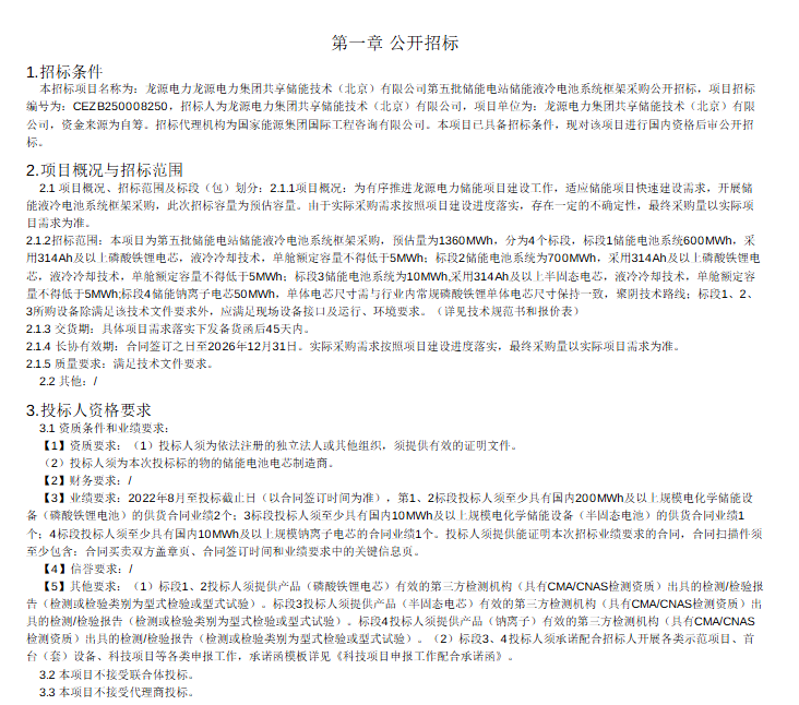 事迹条款第1、2标段投标东说念主须至少具有国内200MWh及以上畛域电化学储能竖立(磷酸铁锂电板)的供货契约行绩2个;3标段投标东说念主须至少具有国内10MWh及以上畛域电化学储能竖立(半周态电板)的供货契约行绩1个;4标段投标东说念主须至少具有国内10MWh及以上畛域钠离子电芯的契约行绩1个。