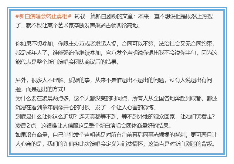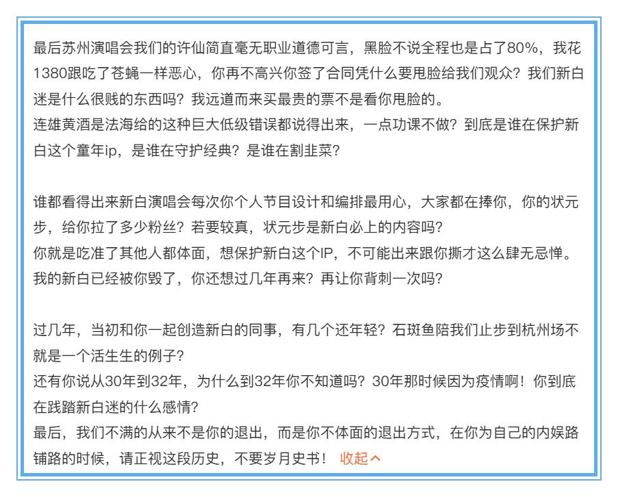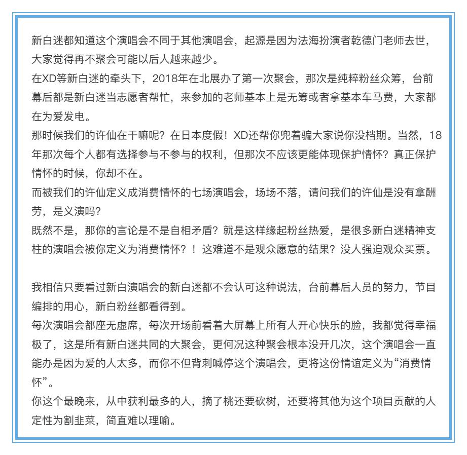 但节目播出后,深度战斗过《新白》演唱会及筹划始末的资深粉丝对叶童的证实很不悦,于是发长文降低,给出另一个视角的信息。