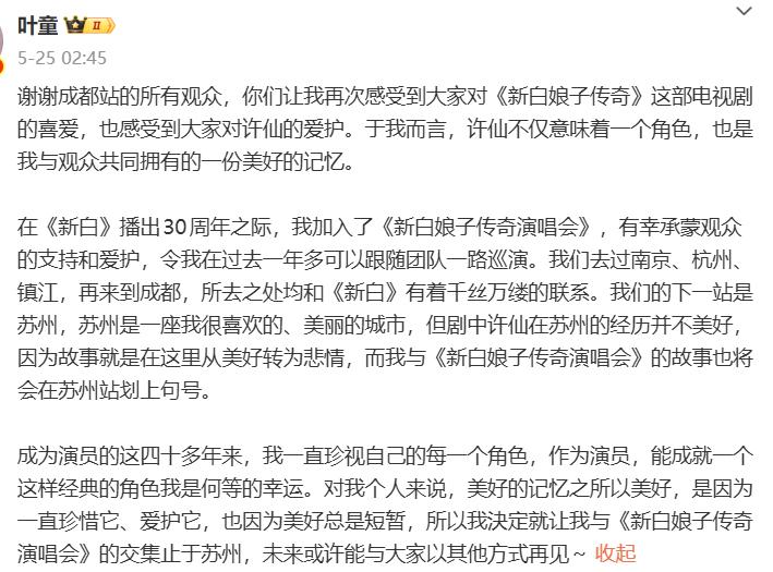 本年 5 月叶童晓示与《新白娘子外传》巡回演唱会的错乱将阻隔于苏州,加上苏州这场,她与其他主创共同给剧粉带来 7 场《新白》演唱会。