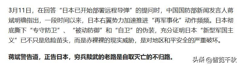早在3月11日,国防部发言东说念主蒋斌在回答日本近期已开动部署而已导弹的涉军问题时,就刺破,日本依然绝对撕下专守守护伪装,所谓新式军国宗旨不再是苗头,而是执行要挟。