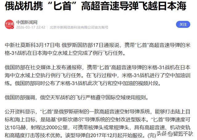 俄国防部通报,佩戴“匕首”细密音速导弹的米格-31在日本海中立水域上空完老例行震动任务。