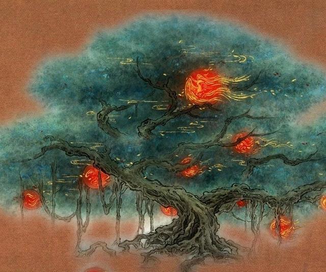 这个造型险些和《山海经》里的记录一模相同。《山海经·外洋东经》说:“汤谷上有扶桑,旬日所浴,在黑齿北。居水中,有大木,九日居下枝,一日居上枝。”十个太阳住在扶桑树上,九个鄙人面,一个在上面。