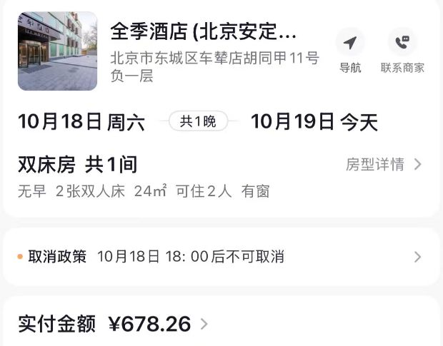 张姑娘告诉记者,她和一又友近日在北京旅游,在外交平台订了全季货仓(北京南锣饱读巷逍遥门地铁站店)10月18日至10月19日一晚的住宿,房费约678元。