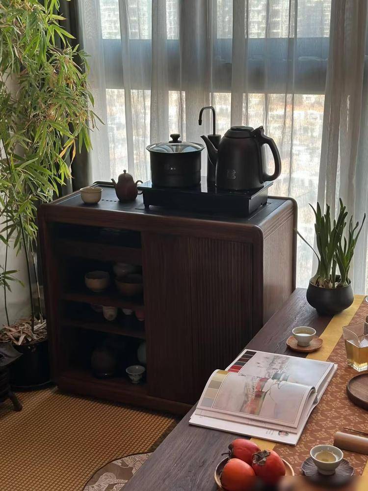 挪动茶水柜。不仅如斯,在空间应用上,这个小茶肆也有着独到的一处预备,那即是中央处还放了一个挪动茶水柜,既能收纳茶具和一些干货,又能将泡好的茶水甩掉在这个柜子上。