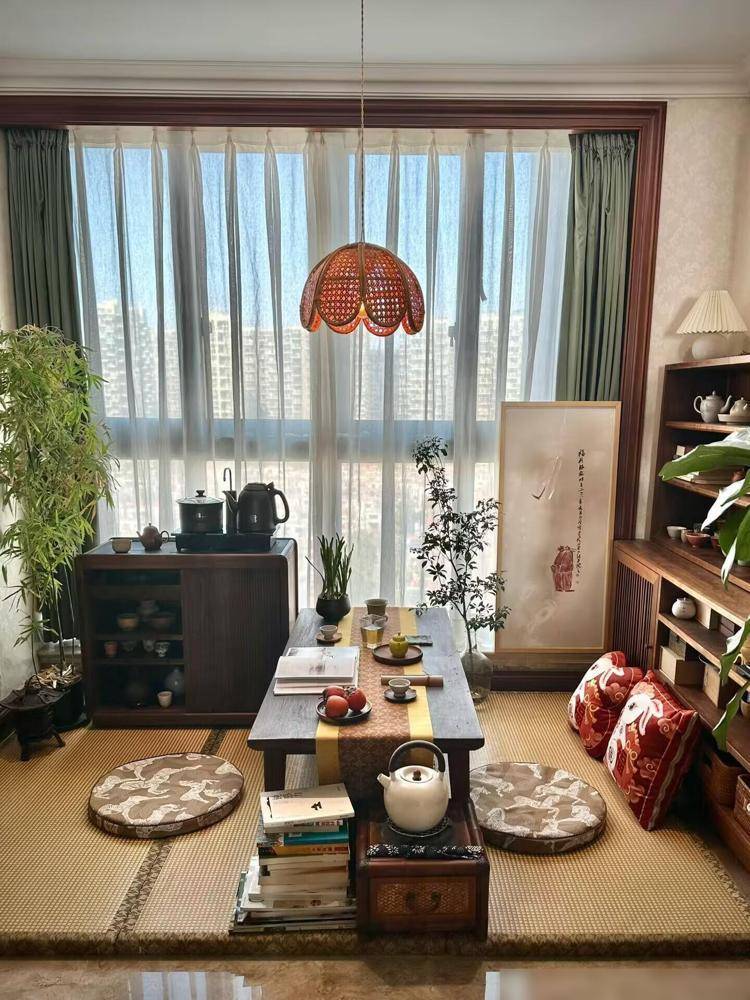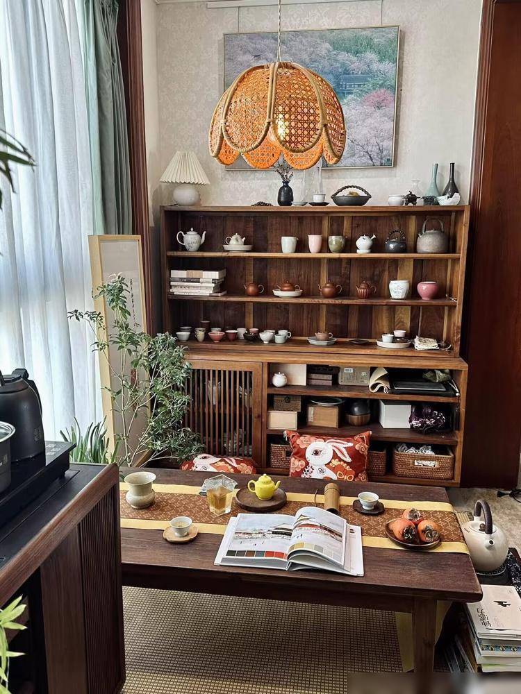 诚然夜晚也要有不同的好意思感,是以在窗帘上方还挂着一盏古色古香的吊灯,白炽灯泡散逸出顺心而柔顺的光泽,让所有空间看起来既亮堂又温馨,这种灯光为咱们带来了恬逸和舒缓,相配适合清闲地将一壶好茶逐渐喝完。